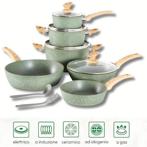 Zestaw naczyń wyprodukowany we Włoszech z granitową powłoką nieprzywierającą, idealny do płyt indukcyjnych, gazowych i ceramicznych, aby gotować bez tłuszczu i oleju bezpiecznie, zdrowo i szybko.